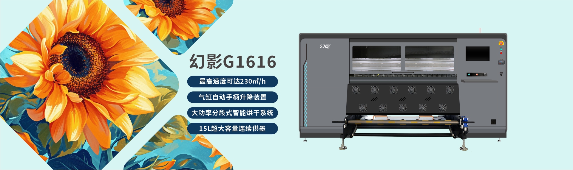 广告加工行业内卷,价格“跌跌”不休,越来越多的客户寻求效率革新。幻影G1616十六头高速写真机应时代而来,高品质输出230㎡/h,助力客户快速响应市场变化,提升行业竞争力;还可配套组建广告自动化生产线,让打印更便捷!