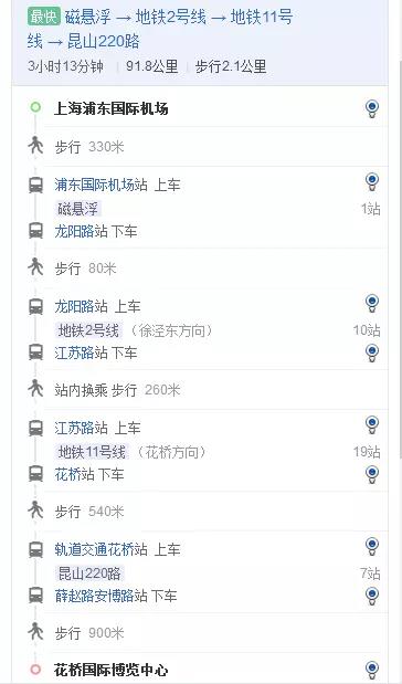 从浦东国际机场至花桥国际博览中心94公里左右【打车按最短路程计算在343元左右】地铁乘车路线如下: