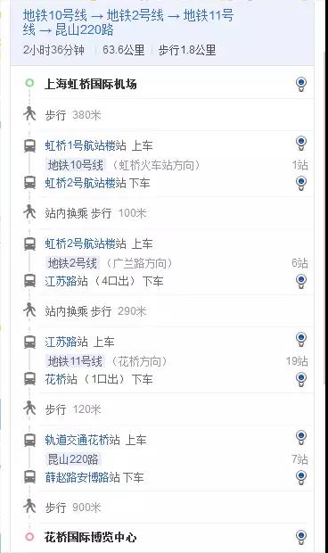 从虹桥国际机场至花桥国际博览中心35公里左右【打车按最短路程计算在124元左右】地铁乘车路线如下: