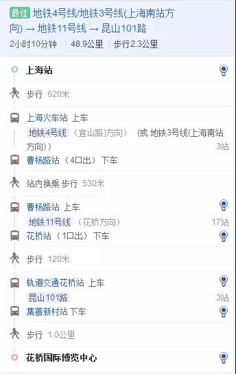 从花桥站至花桥国际博览中心7公里左右【打车按最短路程计算在23元左右】地铁乘车路线如下: